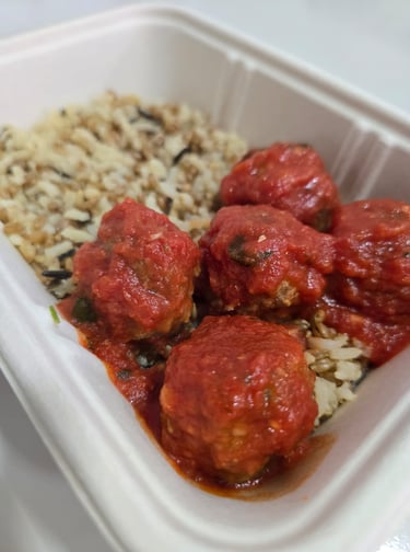 21. Almôndegas com arroz (160 gramas de arroz com 120 gramas de almôndegas de patinho em molho ao sugo).................................................................................R$30,90